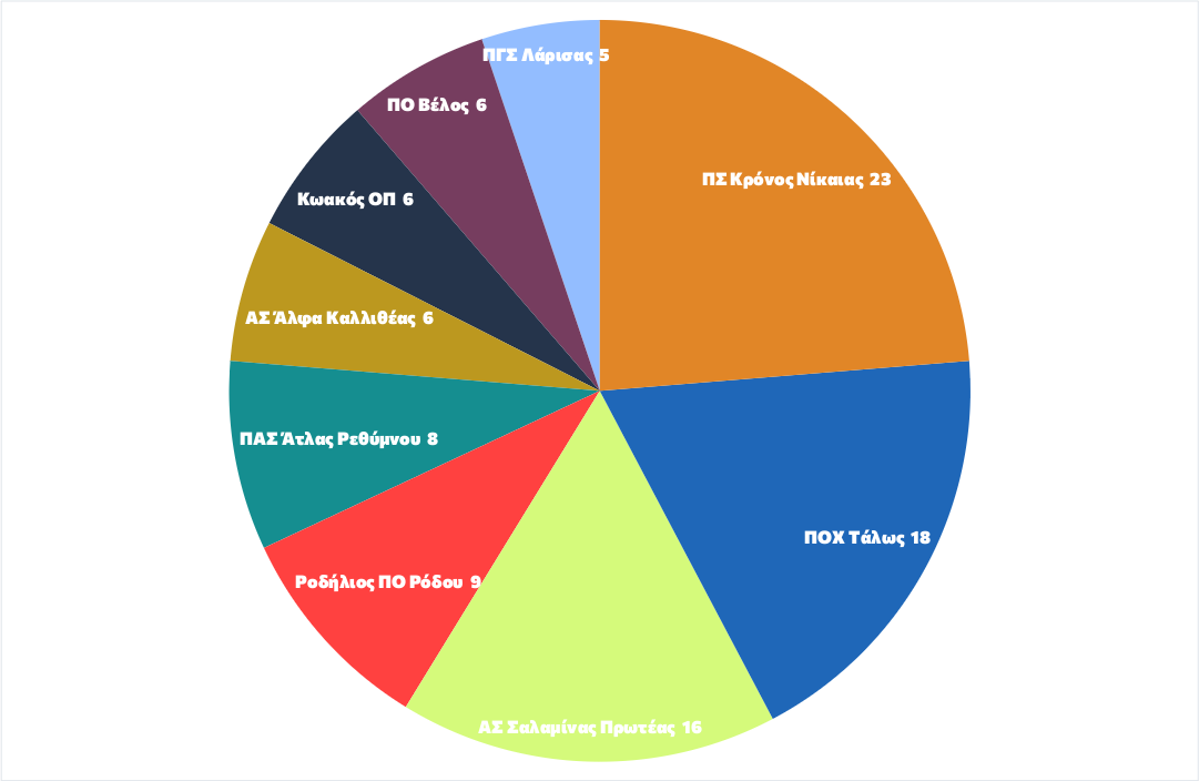 ΠΣ Κρόνος Νίκαιας (23), ΠΟΧ Τάλως (18) και ΑΣ Σαλαμίνας Πρωτέας (16) ήταν οι τρεις ομάδες που κατέκτησαν τις περισσότερες νίκες στα Πανελλήνια Πρωταθλήματα του 2025.